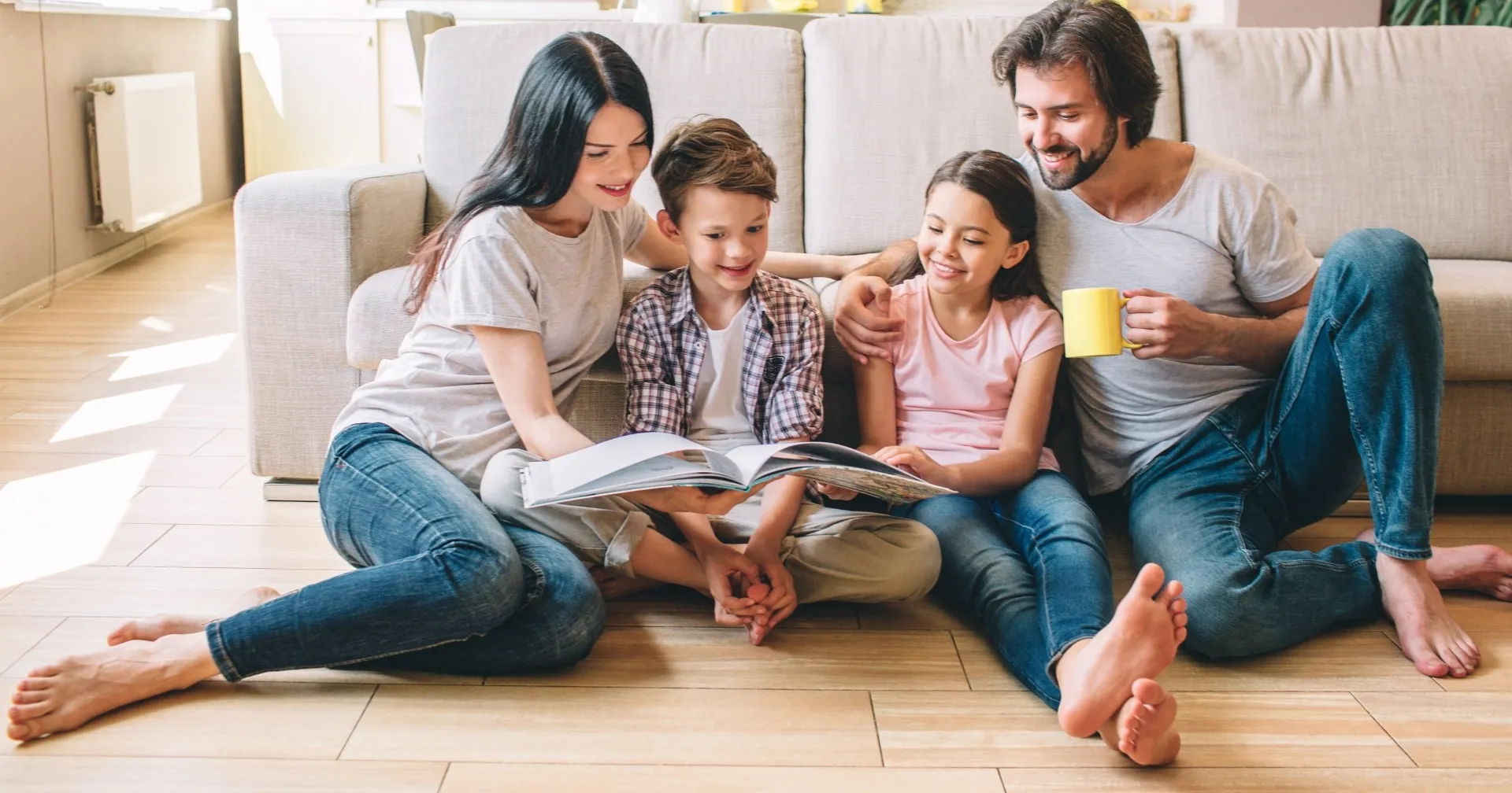 Familie, 2 ouders, 2 kinderen lezen samen in een boek